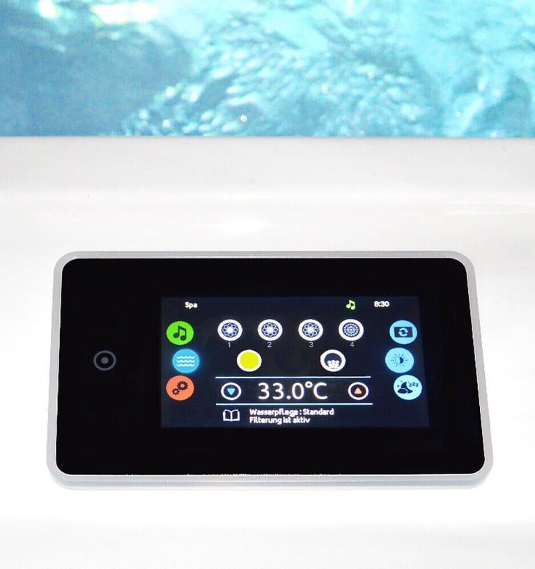 Unsere Premium Whirlpools sind mit der marktführenden Gecko Alliance™ Steuerung aus Kanada ausgestattet. Das intuitive Touch-Farbdisplay und die komfortable WiFi-App ermöglichen Ihnen die einfache Bedienung Ihres Whirlpools per Smartphone – jederzeit und überall. So steuern Sie Ihre Wellnessoase smart und bequem von zu Hause oder unterwegs.